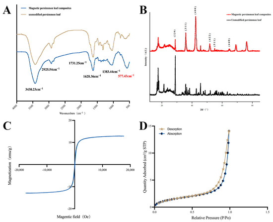(A) Fourier transform infrared spectrum of magnetic persimmon leaf composites and unmodified persimmon leaf; (B) X-ray diffraction plot of magnetic persimmon leaf composites and unmodified persimmon leaf; (C) Vibrating sample magnetometer of magnetic persimmon leaf composites; (D) N2 adsorption-desorption isotherms of magnetic persimmon leaf composites.