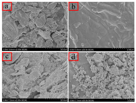 SEM was employed to examine the microstructure of the prepared materials. As illustrated in Figure 2a,b, untreated persimmon leaves display a layered structure with irregular surface features and discernible pores. These irregularities enhance the probability of contact between the material and analyte in the solution, facilitating adsorption. Figure 2c,d highlight numerous cracks and folds on the surface of the magnetic composites, providing additional adsorption sites and larger pores for analytes. Consequently, the increased specific surface area proves advantageous for effective adsorption.