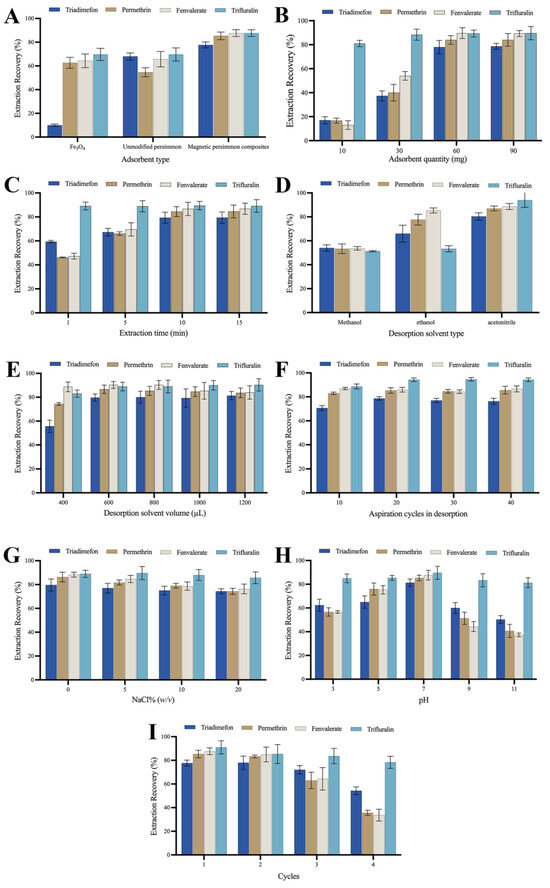 (A) Effect of the type of adsorbent; (B) Effect of the adsorbent amount; (C) Effect of the extraction time; (D) Effect of the desorption solvent type; (E) Effect of the desorption solvent volume; (F) Effect of aspiration cycles in desorption; (G) Effect of the ionic strength; (H) Effect of the pH; (I) Extraction reutilization of magnetic persimmon leaf composites.