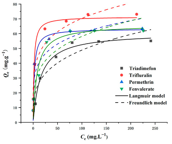 The interaction between magnetic persimmon leaf composites and four pesticides was investigated through adsorption isotherms. Adsorption experiments covered a range of initial pesticide concentrations from 10 to 300 mg L−1. As the initial concentration increased, the adsorption capacity of the magnetic persimmon leaf composites exhibited a rapid and equilibrating rise. This phenomenon is attributed to the elevated initial target concentration, which provides an enhanced driving force to overcome mass transfer resistance between solvent and solute surfaces [54]. The Langmuir model, suitable for simulating monolayer adsorption on surfaces with a limited number of similar sites, and the Freundlich model, designed for adsorption on amorphous surfaces assuming non-homogeneity, were employed [55,56]. The results, presented in Figure 4 and Table 1, reveal a well-fitting Langmuir isotherm with R2 values up to 0.97, indicating homogeneous adsorption of pesticides. The maximum adsorption capacities, calculated using the Langmuir isotherm model, were 73.75 mg g−1 for trifluralin, 58.07 mg g−1 for triadimefon, 65.35 mg g−1 for permethrin, and 63.82 mg g−1 for fenvalerate, closely aligning with actual data. Additionally, RL values between 0 and 1, as per experimental results, suggest that the synthesized magnetic persimmon leaf adsorbent effectively facilitated the adsorption of the target analytes [57].