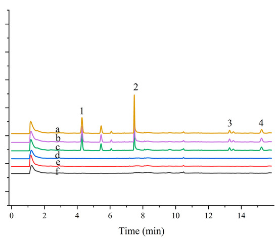 Application of magnetic persimmon leaf composite in environmental water sample analysis: (a) Pretreated Olympic Forest Park water sample spiked at 200 µg L−1; (b) Pretreated Beijing Sun Park water sample spiked at 200 µg L−1; (c) Pretreated Campus water sample spiked at 200 µg L−1; (d) Olympic Forest Park water sample not spiked; (e) Beijing Sun Park water sample water sample not spiked; (f) Campus water sample not spiked. Peaks: (1) Trifluralin (2) Triadimefon (3) Permethrin (4) Fenvalerate.