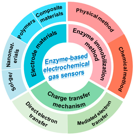 Electrochemical techniques are advantageous due to their simplicity and high detection efficiency. The typical electrochemical biosensor consists of an analyte, receptor, and transducer [13]. Electrochemical sensors have been widely used in gas detection by transducing the chemical reaction at the electrode–solution interface into current signals via electric potential. In the detection of gas molecules, receptors play a crucial role in enzyme-based electrochemical gas sensors. Gas molecules and enzymes are specifically compatible, leading to their binding and production of electrons as signals. Consequently, a transducer is employed to convert this signal into measurable electrical signals. The electrochemical electrode translates the chemical reaction occurring in the active component into an amperometric or potentiometric signal. Enzyme biological amperometry sensors, unlike traditional amperometry sensors, utilize enzymes as catalysts at the electrode rather than noble metals like gold, platinum, and palladium. Gas molecules are typically detected through either physical binding or a chemical reaction that occurs at the electrode [14]. However, their electroactive centers are often tightly closed or insulated by the enzyme protein body, making electron transfer between the enzyme and the electrode difficult [15]. Meanwhile, several factors influence the reaction rate and the quality of the signal transfer. It is beneficial to design electrode surfaces rationally to optimize the interaction between the enzyme and the electrode surface when considering electron transfer. The interface of enzyme electrodes in electrochemical gas sensors is particularly important for high-level development. To achieve high-performance enzyme electrochemical gas sensors, optimization strategies have been implemented, including the immobilization of the enzyme, electrode material, and charge transfer mechanism, which are graphically represented in Figure 1.