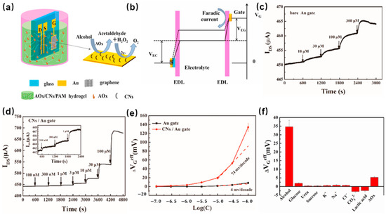Vianello et al. [24] designed an ion-sensitive field-effect transistor (ISFET) in conjunction with an aldehyde dehydrogenase specific for the detection of formaldehyde. The silicon nitride is applied for the gate dielectric of silicon-integrated ISFET. The formaldehyde dehydrogenase enzyme is immobilized on the surface of silicon nitride through covalent binding. In the sensing process, the nicotinamide adenine dinucleotide (NAD) was applied as a cofactor, catalyzing the oxidation of the formaldehyde molecule. The detection limit of this sensor is about 0.1 ppm. Zhao et al. [25] developed a breath alcohol biosensor based on a hydrogel-gated graphed field-effect transistor. The carbon nanosheets (CNs) were synthesized through fast pyrolysis of chlorella. Then, alcohol oxidase (AOx) was introduced into the substrate to detect alcohol in real time. The structure of the hydrogel-gated graphed field-effect transistor is shown in Figure 3a. There are three electrodes, namely gate, source, and drain, which contact the hydrogel. Due to the high carrier mobility feature of graphene enabling a significant field-effect amplification of the sensor, that was applied to construct the channel of the source and drain electrodes, the carbon nanosheets were employed to modify the gate electrode. The alcohol-sensing mechanism of the sensor depends on the oxidation reaction of alcohol by AOx and the electrocatalytic oxidation reaction of the generated H2O2. In detail, the enzymatically produced H2O2 will be oxidized on the surface of the Au gate electrode under a bias voltage. In this reaction, the electrons will be transferred to the gate electrode, and the Faradaic current will be generated by the redox reaction of H2O2 on the gate surface, which will cause the change of effective gate voltage, as shown in Figure 3b. The channel current response to H2O2 for the bare Au gate and CN-modified Au gate, as shown in Figure 3c,d. The CN-modified Au gate field-effect transistor alcohol oxidase electrochemical gas sensor exhibits a better sensitivity and lower limit of detection to 100 nM, 100 times lower than that of the device with a bare Au gate. As shown in Figure 3e, the effective gate voltage change vs. H2O2 concentration in logarithm. The CN-modified gate SGGT shows a response of 74 mV per decade, which is higher than that of the bare Au gate SGGT (4 mV per decade). Meanwhile, the CN-modified Au gate exhibits a dramatic enhancement in the current response. In addition, to verify the sensor’s specificity, interfering components were used in the detection of alcohol. As Figure 3f shows, the AOx/CN-modified gate sensor demonstrates excellent selectivity to alcohol. This sensor has been successfully applied to breath tests after alcohol drinking.