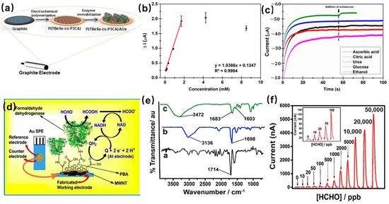 (a) Schematic of sensing device containing graphite electrode, a network of polymer and AOx; (b) Amperometric response of the alcohol sensors to increasing ethanol concentrations; (c) Effect of interfering substances on biosensor performance [44]; (d) the immobilization of the formaldehyde dehydrogenase and the mechanism for catalyzing formaldehyde; (e) The FTIR spectra of formaldehyde dehydrogenase immobilized on pyrenyl carbon nanostructures; (f) Amperometric responses for various concentration of formaldehyde [37].