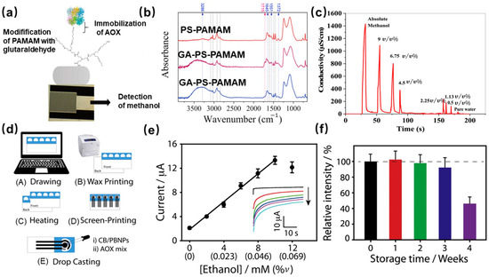 Razmshoar et al. [35] created a conductometric enzymatic methanol sensor by grafting alcohol oxidase (AOx) onto electrospun polystyrene-poly(amidoamine) dendritic polymer nanofibers. To form a strong link between AOx and the surface of nanofibers, glutaraldehyde coupling was used to form a bond between the amine groups of the AOx enzyme and the nanofiber dendritic polymer groups (Figure 6a). The FTIR spectra, which were used to evaluate the chemical structure, showed a peak at 1674 cm−1. This peak is assigned to the group and confirms the covalent link between the polystyrene-poly(amidoamine) and the glutaraldehyde. Notably, this peak is due to the binding between the AOx and glutaraldehyde, as depicted in Figure 6b. This sensor was applied for the detection of gaseous methanol concentrations above different methanol/water solutions (Figure 6c). The sensor showed rapid response/recovery performance: the response time was from 13 s to 35 s, the recovery time from 6 s to 10 s was from a lower concentration of methanol to its higher concentrations, and the detection limit was 100 ppm. Niculescu et al. [46] have developed an ethanol biosensor based on dehydrogenases, Poly(vinyl imidazole) complexed with Os(4,40-dimethyl bipyridine)2Cl employed as the electrochemical mediator, and poly(ethylene glycol)-diglycidyl ether as the crosslinking agent. The developed enzyme sensor has been successfully employed for the detection of ethanol in wines. Cinti et al. [19] reported a paper-based electrochemical ethanol biosensor. The electrode was modified by carbon black (CB) and Prussian blue nanoparticles (PBNPs), and then the AOx enzyme was immobilized via crosslinking, the fabrication route is shown in Figure 6d. The ethanol-sensing performance as Figure 6e shows, the chronoamperometric records of ethanol concentration up to 10 mM in 100 μL of 0.05 M phosphate-buffered solution containing 0.1 M KCl at pH 7.4, displaying a very quick and sensitive response after just 40 s. Meanwhile, the shelf-life of the biosensor was evaluated, as Figure 6f shows no significant decrease in initial activity after storage of 3 weeks, but the response decreased by 50% after the fourth week. This method can improve the stability and reaction rate of the enzyme but may affect the activity of the enzyme.