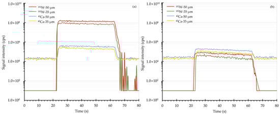 Transient signal profiles of Ca and W. Panel (a) and panel (b) were the transient signal results of scheelite and NIST SRM 610, respectively. Here 50 and 35 μm spot sizes were utilized.