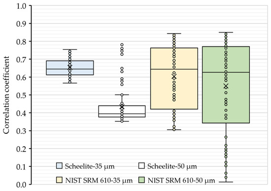 To further evaluate the ablation behaviors, the correlation coefficients of transient signal intensities between Ca and W within the ablation process at 35 and 50 µm spot sizes were analyzed (see Figure 2). As shown in Figure 2, the values of the correlation coefficient were found to be less than 0.9, revealing that the two elements had a relatively independent relationship during the interactions of the target (i.e., scheelite and NIST SRM 610) with pulse lasers. However, it is worth noting that there were outliers of the correlation coefficients in the ablation of scheelite using a 50 µm spot size, which was consistent with the slightly higher element fractionation effect of W in scheelite samples. Hence, a 35 µm spot size was used as default in the subsequential quantification analyses.