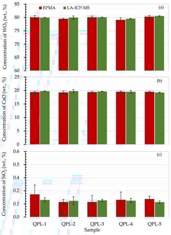 To further assess the quantification accuracy of scheelite samples by the proposed LA-ICP-MS, concentration results of CaO, WO3, and SiO2 were then compared to the values obtained by EPMA. As shown in Figure 3a,b, it is clear that the concentrations of matrix CaO and WO3 from LA-ICP-MS analysis agreed well with results from EPMA analysis, giving concentration ratios within 0.98–1.01 (see Figure S1). Additionally, the minor component SiO2 with values of 0.13–0.19% from LA-ICP-MS analysis was found to fall within the concentration range given by EPMA (see Figure 3c). It is worth noting that the concentration results of SiO2 from LA-ICP-MS analysis exhibited better precision with standard deviations of less than 0.04%, which might be attributed to the larger sample mass sampled via laser ablation and, thus, the micro-heterogeneities or inclusions hidden under the sample surface such as QPL-1 were not noticeable.