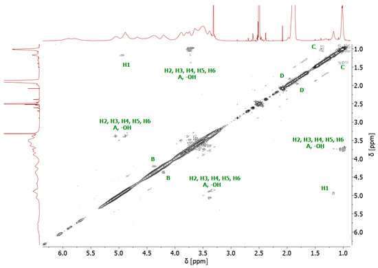 The bromoesterification of the initiator with the -OH groups was also verified by 13C NMR spectroscopy. The 13C NMR spectrum of the bromoesterified initiator exhibited a signal at 171 ppm, corresponding to the carbonyl carbon of the ester group, and a signal at 31 ppm, corresponding to the carbon attached to the bromine atom (Supplementary Figure S3). Two-dimensional (2D) gradient-selected correlation spectroscopy (gCOSY) NMR was also performed to confirm the structure and corresponding signals (Figure 3).