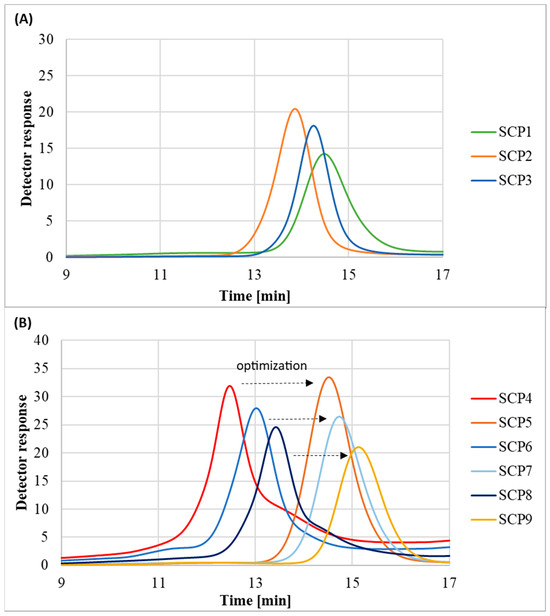 The molecular weight distribution values of the obtained polymers SCP1-SCP3 stayed in the range of 1.23–1.38 and chromatograms showed monomodal peaks, which indicates that the OEOMA500-based polymers were synthesized in a controlled manner (Figure 6A). However, in the case of OEOMA300-based polymers synthesized without the addition of methanol, it was observed that besides the main signal, there were also peaks corresponding to the high and low molecular weight species. In order to regain control over the polymerization process, the reactions were repeated with the exception that the initiator was dissolved in a small amount of methanol prior to addition to the reaction mixture. Lack of control over the polymerization process in the case of the OEOMA300 monomer was probably linked with its lower hydrophilicity in comparison to the OEOMA500 (Figure 6B) [32].