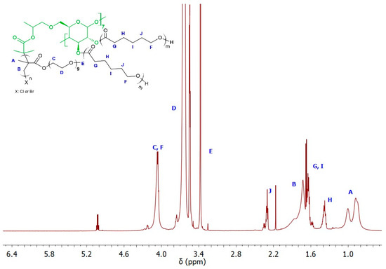 The structure of 8-Br-HP-β-CD was confirmed by spectroscopic and spectrometric analyses. ATR-FTIR analysis confirmed the bromoesterification reaction (Supplementary Figure S2). The peak corresponding to the stretching vibrations of the -OH group decreased its intensity after the reaction, which indicates partial substitution of the -OH groups in the molecule. The peak responsible for the –C=O stretching vibrations present in the spectrum of the initiator proves that the CD was successfully modified. Analysis of the 1H NMR spectrum confirmed the presence of eight bromoester groups in the CD molecule (Figure 2). The degree of -OH groups substitution in HP-β-CD was calculated from the integrals of the peaks assigned to the acetal proton (H1) and six protons from the bromoester group.