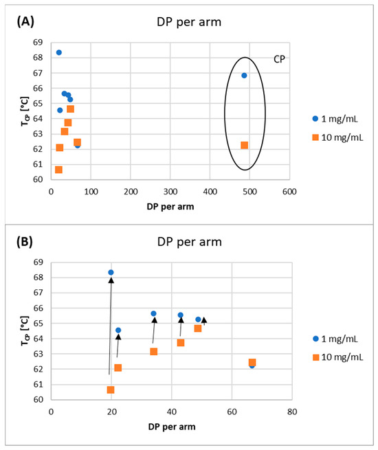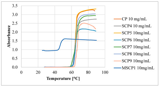 This indicates that the polymer–polymer interactions are stronger than the polymer–water interactions at higher polymer concentrations. However, as the DParm values increase, the differences between the TCP values decrease, until the DParm > 60 repeating units, where this difference disappears completely. To verify the effect of polymer topology on the TCP value, a comb-like polymer (CP) was synthesized via the utilization of HO-EBiB initiator and OEOMA300 as the monomer. The CP obtained using the enzymatically assisted ATRP method displayed TCP values comparable to those reported in the literature. Namely, TCP of P(OEOMA300) solution in water at a concentration of 2 mg/mL was equal to 66.5 °C, and for P(OEOMA300) solution in water at a concentration of 5 mg/mL TCP was equal to 66 °C [35,36]. In our studies, TCP values for CP solution in water were equal to 66.85 °C at a concentration of 1 mg/mL and 62.25 °C at a concentration of 10 mg/mL These results slightly differed from those obtained for the star-comb polymers (TCP in the range of 60.65–64.65 °C for 10 mg/mL), confirming that the polymer architecture influences the TCP. This evidence further supports the notion that the star-comb architecture does indeed affect the thermosensitivity of the polymers. In general, the TCP values of the star-comb polymers showed a positive correlation with the arm length, i.e., the degree of polymerization per arm. It can be explained by the reduced hydrophobicity and enhanced solvation of the polymers with longer arms. The absorbance plots of the tested polymers differ in terms of maximum end values (Figure 9).