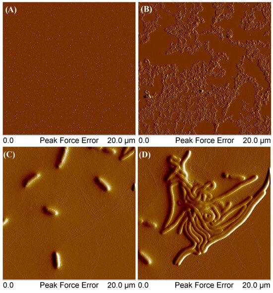 AFM images of obtained MSCP1: At a concentration of 0.001 g/mL (A), at a concentration of 0.01 g/mL (B), and at a concentration of 0.001 g/mL from a solution that was set aside for a week (C,D).