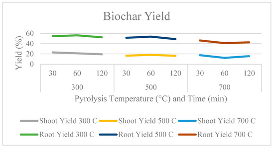 Based on the TGA data, a two-factor factorial design was utilized to produce biochar, with the first factor being pyrolysis temperature and the second being residence time. Three sets of pyrolysis temperatures (300, 500, and 700 °C) and residence times (30, 60, and 120 min) were used to design the experiment. Intermediate pyrolysis was chosen over low temperature and fast torrefaction as several studies have shown that the physicochemical characteristics of biochars are enhanced with increasing temperatures [21,43,44]. Biochar was generated in batches of 10 g of finely chopped biomass (shoots and roots), approximately 1 mm in size, and added to porcelain crucibles with lids (Cole-Palmer, Vernon Hills, IL, USA). The feedstocks were subjected to pyrolysis in a 51862 HR Lindberg furnace with a nitrogen gas retort (Watertown, WI, USA) at a flow rate of 0.1 mL min−1. The temperature was raised from the ambient temperature of 25 °C to the desired temperature at a rate of 10 °C/min. The biochars were ground in a ball mill according to Na Nagara et al. [45] with minor procedural modifications. Various physicochemical properties of the biochars were evaluated along with their elemental analysis and surface morphology.