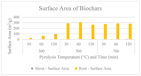 A significant (p < 0.05) increase in the total surface area of biochars occurred with rising temperatures, as seen in Figure 1. Vetiver roots are more suitable for pyrolysis than shoots, and the surface area of root biochars was significantly larger (p < 0.01) than that of the shoots. The biochar generated at 500 °C for 60 min had the highest surface area (308.15 m2/g). The composition of cellulose plays a key role in pyrolysis, as is clear from prior research, with cellulose microfibrils predominating the pyrolysis dimensional change process [23].