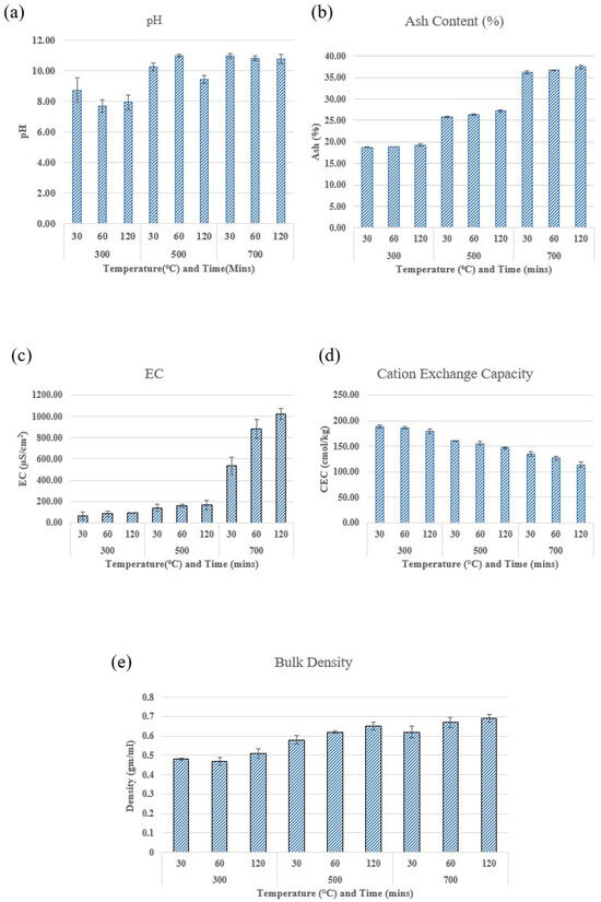Biochar produced at higher temperatures possesses an ash component with micronutrients that can aid in replenishing nutrient-deficient soils, thereby enhancing agricultural yields [17]. With an increase in pyrolysis temperature, the bulk density showed a tendency to rise (Figure 2e). At a certain temperature, residence time has little effect. Biochar generated at 700 °C and kept for 120 min has the maximum bulk density, according to previous reports. The bulk density may have an absolute impact on the soil’s composition. Biochar with low bulk density may promote soil porosity, minimize compaction [15], and improve root growth and air and water circulation. The growing carbon content is another factor contributing to the higher bulk density at high temperatures [18].