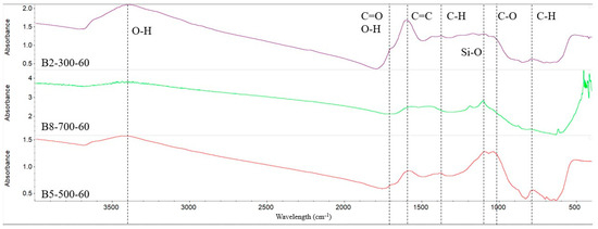 Fourier transform infrared (FTIR) spectra of the biochar at 300, 500, and 700 °C for 60 min each.