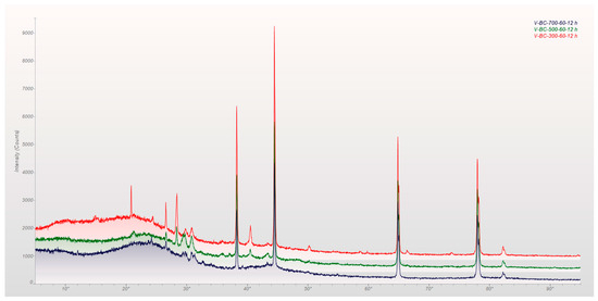 Table 2 lists the main elements of vetiver biochar in comparison to other C4 grasses. All the mineral peak intensities decreased as pyrolysis temperatures increased, which is consistent with cellulose degradation [25]. At the same temperature, there were hardly any differences between the samples, but at various temperatures, the samples were distinguishable. Compared to powder diffraction and standards (PDF), these noticeable peaks in the biochars demonstrate the presence of inorganic components, including SiO2, KCl, and CaCO3. The presence of aluminum in the main peaks may be the result of scattering from the sample holder, which may be disregarded, while several unidentified peaks could not be located. Sylvite and calcite were also present in the C4 grasses studied by other researchers [25,26,27,28,29].