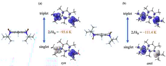 - Shultz, D.A.; Fico, R.M.; Lee, H.; Kampf, J.W.; Kirschbaum, K.; Pinkerton, A.A.; Boyle, P.D. Mechanisms of exchange modulation in trimethylenemethane-type biradicals: The roles of conformation and spin density. J. Am. Chem. Soc. 2003, 125, 15426–15432. [Google Scholar] [CrossRef]
