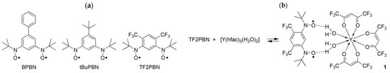 - Sekine, H.; Ishida, T. Unexpected Complexes of a [3+3] Cycloadduct from Biphenyl-3,5-diyl Bis(tert-butyl Nitroxide) with Gadolinium(III) 1,1,1,5,5,5-hexafluoropentane-2,4-dionate. Chem. Lett. 2018, 47, 74–77. [Google Scholar] [CrossRef]
