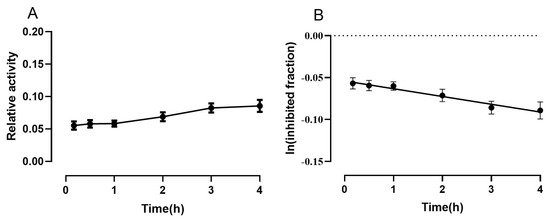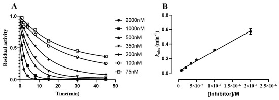 The value of kI for MTR-3 with eqBChE was determined as previously reported [8,12,13]. EqBChE was pre-incubated with seven concentrations of MTR-3 and a vehicle for set time intervals (1 min, 2 min, 4 min, 8 min, 15 min, 30 min and 45 min), and the activities were detected as described in Section 3.3.1. The concentrations of MTR-3 were 2 × 10−6 M, 1 × 10−6 M, 5 × 10−7 M, 3.5 × 10−7 M, 2 × 10−7 M, 1 × 10−7 M and 7.5 × 10−8 M.