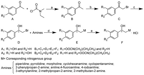 Bambuterol acts as a potent pseudo-substrate inhibitor of BChE. The difference in the structure of the choline binding sites between AChE and BChE contributes to the high specificity of bambuterol for BChE [10]. It is reasonable to predict that the ethanolamine side chain of bambuterol plays a key role in its high specificity for BChE. Rivastigmine is a dual inhibitor of AChE as well as BChE and has the same inhibitory mechanism and ChE binding sites as bambuterol [7]. On this basis, we hypothesized that the rivastigmine–bambuterol hybrid MTR-1 could have a much higher BChE selectivity than rivastigmine. Indeed, we found that MTR-1 has specific inhibitory activity towards BChE and could be regarded as a leading compound to find novel specific BChE inhibitors (Shown in Table 1). We then investigated modifications of MTR-1 involving the position of the carbamyl ester and substitutions of the tert-butylamine group, taking into account the structure–activity relationships of the bisdimethylcarbamate derivatives of metaproterenol and isoproterenol, as well as those of bambuterol analogues [11,12]. The synthesis of MTR-1 and its analogues is systematically represented in Scheme 1. We attempted the isolation of MTR-1 and MTR-2 as hydrochloride salts to enable purification via recrystallization according to the procedure used for the bambuterol analogues BD-6 and BD-11 reported in our previous work [12]. However, those two compounds did not form solid hydrochloride salts and were eventually purified by column chromatography. All the other analogues were directly purified by column chromatography without attempting to isolate them as solid salts.