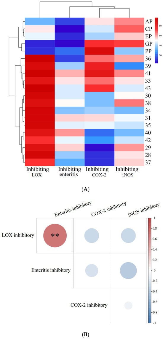 Inhibitory activity of PECS and PPE against enteritis, LOX, COX-2 and iNOS, and correlation analysis between these activities. In (A): The EP, CP, PP, AP and GP indicate echinacea polyphenol, cinnamon polyphenol, pomegranate peel polyphenol, apple polyphenol and grape skin polyphenol, respectively. In (B): the red dots indicate positive correlation, blue dots indicate negative correlation; the darker the color, the higher the correlation. ** indicates significant correlation at 0.01 level.