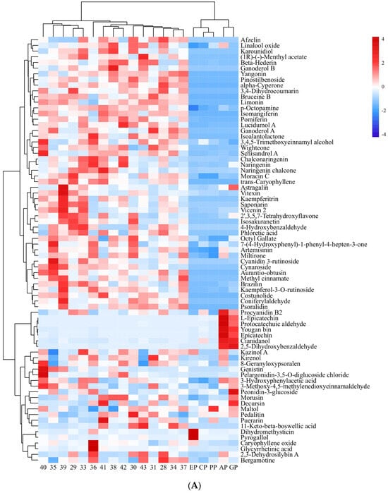 Heatmap of small-molecule organic compounds’ content and correlation coefficient. (A): Heatmap of small-molecule organic compounds’ content. The numbers indicate samples of PECS. The EP, CP, PP, AP and GP indicate echinacea polyphenol, cinnamon polyphenol, pomegranate peel polyphenol, apple polyphenol and grape skin polyphenol, respectively. Red indicates high content; blue indicates low content. (B): Heatmap of correlation coefficient between small-molecule organic compounds’ content and the anti-enteritis activity of ethanol extracts (PECS and PPE). The numbers indicate the small-molecule organic compounds. Red indicates positive correlation; blue indicates negative correlation; and the darker the color, the higher the correlation.