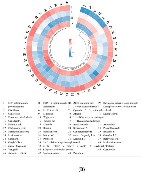 Furthermore, Pearson correlation analysis was conducted with data on the content of 75 small-molecule organic compounds in PECS and the anti-enteritis activity of PECS. As shown in Figure 2B, 42 small-molecule organic compounds showed significant positive correlation with LOX inhibitory activity, whereas seven compounds showed significant negative correlation (p < 0.05). No compounds showed a significant positive correlation with COX-2 inhibitory activity. Cianidanol was the only compound which showed a significant positive correlation with iNOS inhibitory activity (p < 0.05).