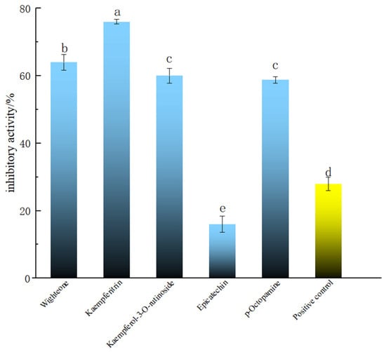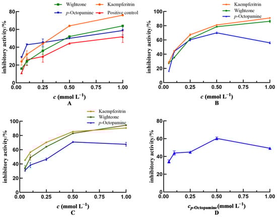 The inhibitory effects of kaempferitrin, wighteone and p-octopamine on LOX activity is shown in Figure 4B. The inhibitory activity of the three tested compounds on LOX was dose dependent. In particular, the inhibitory effect of kaempferitrin (IC50 = 0.130 mmol L−1) was stronger than that of p-octopamine (IC50 = 0.177 mmol L−1) and wighteone (IC50 = 0.216 mmol L−1).