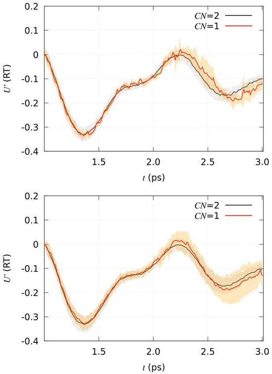 As for the analysis of the energy change upon chemical reactions, the time evolution of (see Section 4) is plotted, once averages are performed within each class of trajectories, in Figure 4.