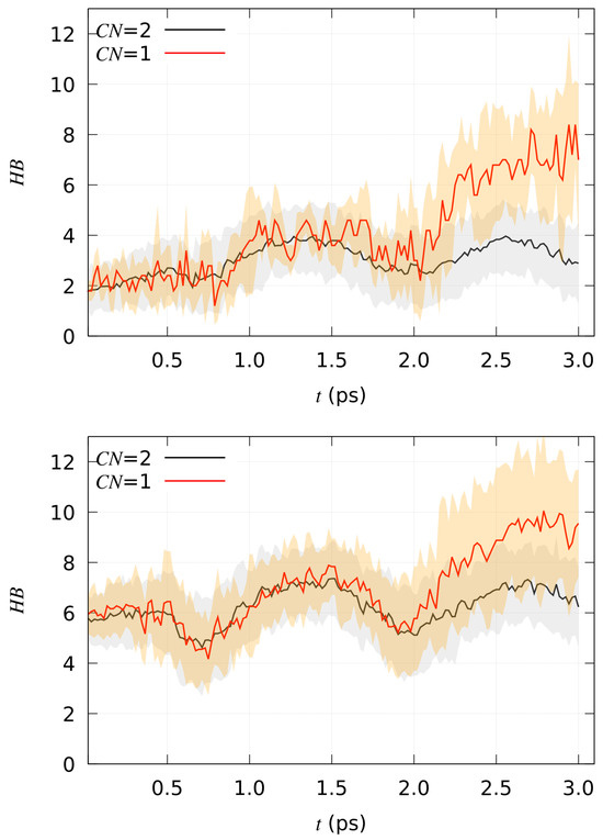 In Figure 5, the time evolution of the number of hydrogen bonds between the solute and the water solvent are displayed as a function of time for all the simulated models 1–3 in the forward process. Reactive and non-reactive trajectories are analyzed separately and displayed as red and black curves, respectively, as in Figure 4. In the figure, the time-evolution during the first ps of thermal equilibration (no steering potential) is also displayed. It can be noticed that in compound 2, the solute is more hydrophilic when in the reactant state, where a larger number of hydrogen bonds are sampled since the beginning compared to 1. The number of hydrogen bonds in the final product is similar in the two compounds, while in reactants, the difference is larger: about four less hydrogen bonds in 1 than in 2. We argue that in compound 2 the reactant is “prepared” for the reaction, a property that is confirmed by the larger number of reactive pathways in 2 than in 1 (see Table 3). Again, there is an effect of average velocities (instantaneous temperature) displayed as an oscillation in the average number of hydrogen bonds. This effect is associated with the oscillatory change in structure in the solvent bath. However, the change in the number of hydrogen bonds due to proton extraction from position is visible, occurring after 1 ps of application of the external force (time 2 ps).