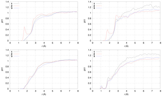 Radial distribution function of solute-O(water) (top) and solute-H(water) pairs (bottom). (Left)—reactant state (0–0.5 ps); (right)—product state (3.5–4.0 ps). 1 is black; 2 red; 3 blue.