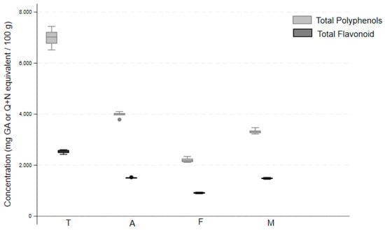 Comparison of total polyphenol and total flavonoid concentrations in four different S. officinalis extracts. Products: SALVITILAB® (T), ACEF (A), Fontana (F), and Menosan® (M). GA, gallic acid; Q, quercetin, N, naringenin.