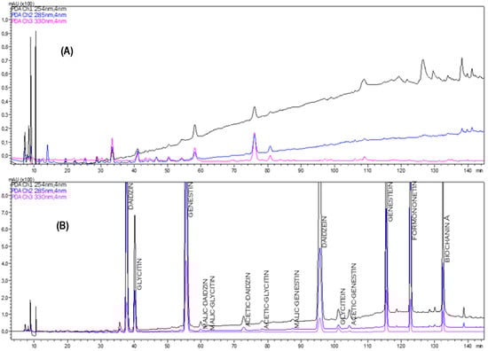 Approximately 600 µL of isoflavonic extract were centrifuged at 14,000 rpm for 6 min, and 10 µL of extract was injected into the HPLC. The samples were eluted on two columns connected in series: the first was a Kinetex C18 5 µm 250 × 4.6 mm column (Phenomenex, Torrance, CA, USA) and the second one was an Atlantis dC18 5 µm 250 × 4.6 mm column (Waters, Milford, MA, USA). The elution of the analytes was performed with 4 solutions: (A) water and methanesulfonic acid at pH 3; (B) acetonitrile 65%, dioxane 10%, water, and methanesulfonic acid pH 3 25%; (C) methanol 65%, dioxane 10%, water, and methanesulfonic acid pH 3 25%; and (D) methanol 85%, dioxane 5%, and isopropanol 10%. The elution steps and ratios of the solutions are shown in Supplementary Table S1. The mobile phase flow rate was 0.5 mL/minutes and the column oven temperature was 24 °C. The isoflavones were identified by comparing the retention time and ultraviolet–visible spectra of the reference standards (daidzin, genistin, daidzein, and genistein; Supplementary Table S2) with the characteristic peaks of soybean and red clover extracts (Figure 1). Quantification was performed using the calibration curves of the reference standards.