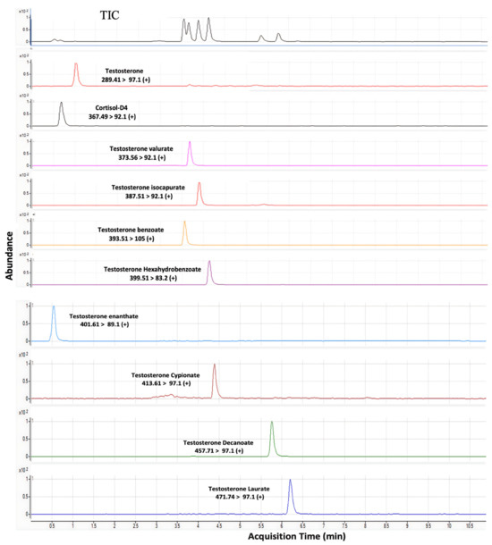 Representative chromatogram of testosterone esters separated by LC–MS/MS.