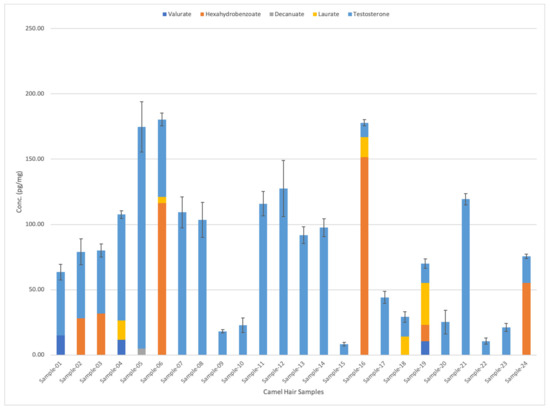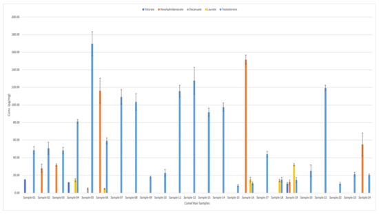 On the other hand, valerate appeared in three different samples with average concentrations of 10.5, 11.7, and 14.98 pg/mg, respectively (as shown in Figure 3). Meanwhile, laurate analytes were detected in five different samples in varying concentrations: 4.83, 14.1, 14.4, 15.1, and 32.1 pg/mg. Finally, decanoate was only detected in Sample 5 (from racing camel), with a concentration of 5 pg/mg. Table 4 shows the detailed comparison of different testosterone esters in camel hair samples. Figure 4 shows the graphical representation of testosterone esters concentrations in 24 camel hair samples.