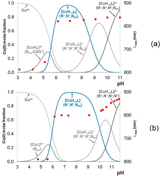 The visible absorption maxima of the solutions are also plotted in Figure 1a,b, and it is evident that the formation of the (N−,N−,Nim)-coordinated species ([CuH−2L] or [CuH−2LH] = [CuH−1L]) from the 1Nim-coordinated one is accompanied by a significant blue shift of the absorption maxima (from 780 to 580–600 nm; see Table 3 and Figure A1 in Appendix A).
