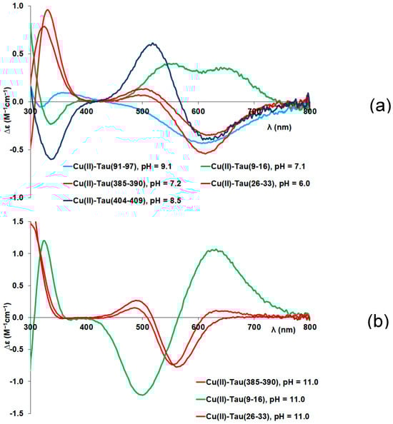 Circular dichroism (CD) spectra provide further support for the above-mentioned coordination modes. Measurable CD spectra can only be detected above pH 5 in parallel with the formation of amide-coordinated complexes (Figure A2 in Appendix A). These spectra are plotted in Figure 2a for the (N−,N−,Nim)-coordinated [CuH−2L] or [CuH−2LH] (3N complexes) and Figure 2b for the (N−,N−,N−,Nim)-coordinated [CuH−3L] species (4N complexes). The corresponding spectra of the complexes formed with the N-terminal fragments (tau(9–16) and tau(26–33)) are also shown for comparison.