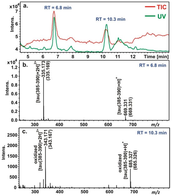 Representative LC-MS chromatogram of the Cu(II):tau(385–390):H2O2:ascorbic acid = 1:1:4:20 system. The total ion chromatogram (TIC) of MS and the UV chromatogram recorded at 222 nm (a); MS spectra obtained at RT = 6.8 min (b) and at RT = 10.3 min (c) (theoretical m/z values are in brackets).