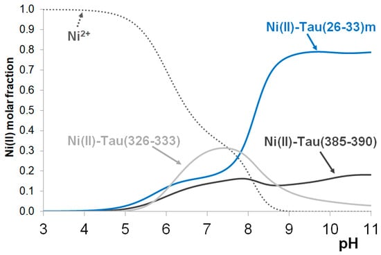 The major conclusions for the nickel(II) complexes, however, can be obtained from the hypothetical concentration distribution curves using the stability constants reported in this study and ref. [23] (Figure 5), where the distribution of nickel(II) ions between the three peptides tau(385–390), tau(26–33)m and tau(326–333) are plotted as a function of pH. It is evident from Figure 5 that the formation of stable nickel(II) complexes occurs only in slightly basic media (above pH~8) when both imidazole and amide nitrogen donors take part in metal binding. It is also obvious that (similar to copper(II) complexes) the fragment tau(26–33), close to the N-terminus, has the highest nickel(II)-binding affinity.