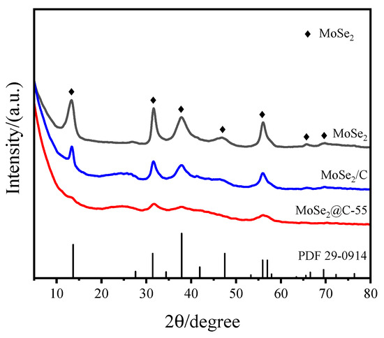 Firstly, X-ray powder diffraction was employed to detect the crystal structure of the prepared samples, and the results are shown in Figure 1. The characteristic diffraction peaks of the three samples appeared at 2θ = 13.7°, 31.4°, 37.9°, 47.5°, 55.9°, 66.5° and 69.5°, corresponding to the (002), (100), (103), (105), (110), (108) and (203) crystal planes of MoSe2 (PDF 29-0914) [], and no other diffraction peaks were found. These results indicate that the MoSe2 crystal phase was prepared. In addition, a slight shift of the (002) crystal plane could be observed, which was attributed to thermal-induced phase segregation []. Compared with MoSe2, the intensity of the diffraction peaks was weakened, and the half-peak width of the corresponding diffraction peaks increased in the XRD patterns of the MoSe2/C sample, indicating that the introduction of a carbon carrier could improve the dispersion of MoSe2 and inhibit the growth of MoSe2 particles. Additionally, the characteristic diffraction peaks corresponding to the (002) crystal plane of graphite carbon were also found at 2θ = 26°. Compared with the XRD patterns of MoSe2 and MoSe2/C, the diffraction peak intensity of MoSe2@C-55 was the weakest, the half-peak width was the widest, and the characteristic diffraction peak (2θ = 13.7°) corresponding to the (002) crystal plane of MoSe2 almost disappeared. These results suggested that the grain size of MoSe2 was the smallest and the layer number of MoSe2 was the lowest in MoSe2@C-55 compared with MoSe2 and MoSe2/C [,]. As a consequence, introducing glucose to the precursor could suppress the growth of MoSe2 through the confinement of the in situ generation of carbon material in the pyrolysis process. When the C/Mo ratio in the precursor was raised from 15 to 75, MoSe2@C-15, MoSe2@C-35 and MoSe2@C-75 were prepared. Their XRD patterns are shown in Figure S1. The intensity of the diffraction peak corresponding to MoSe2 gradually declined with the enhancement of the carbon content in the precursor, which means that the confinement of the in situ carbon material improved with the increase in carbon content, and the growth of MoSe2 particles was repressed, which was beneficial to the dispersion of MoSe2 in the carbon material.
