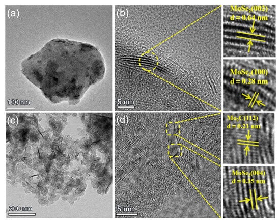 TEM and HRTEM images of MoSe2/C and MoSe2@C-55 catalysts: (a,b) MoSe2/C; (c,d) MoSe2@C-55.
