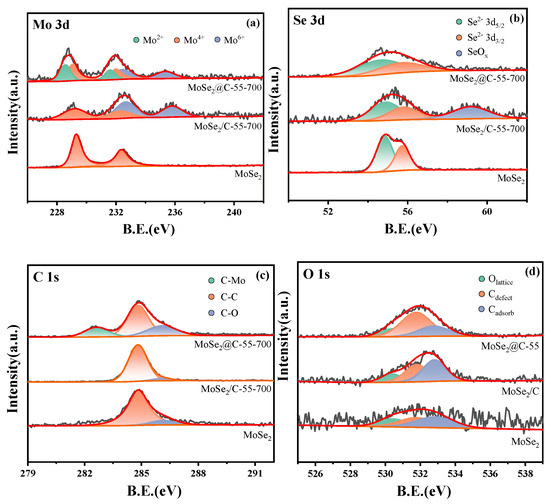 The XPS spectra of the Mo 3d of the three samples (Figure 3a and Table S1) showed that characteristic peaks were observed at 229.1–229.3 eV and 232.1–232.3 eV, which were attributed to Mo4+ 3d5/2 and 3d3/2 in MoSe2 [,]. In addition, fitting peaks at 228.6 eV and 231.6 eV were also found in the Mo 3d of MoSe2@C-55, which corresponded to Mo2+ 3d5/2 and 3d3/2, indicating that Mo2C was generated during the preparation of MoSe2@C-55 [,], suggesting that a strong interaction between the carbon formed by the in situ carbonization of glucose and the Mo atoms was formed. The specific binding energy data in Table S1 show that the binding energy of Mo4+ 3d5/2 and 3d3/2 in MoSe2@C-55 was 0.2 eV lower than that of MoSe2 and MoSe2/C, which was caused by the electron transfer between MoSe2 and Mo2C [], and a strong interaction was formed. In addition, peaks at binding energies of 232.5–232.7 eV and 235.4–235.7 eV, corresponding to Mo-O, were observed due to the surface oxidation that took place when MoSe2@C-55 and MoSe2/C were exposed to air [,,,,,], but the binding energy of MoSe2@C-55 was lower than that of MoSe2/C, which may be due to the protective effect of in situ-formed carbon on the surface of MoSe2@C-55, resulting in a reduction in the oxidation degree. This result demonstrates once again the robust interaction between carbon and Mo in MoSe2@C-55.