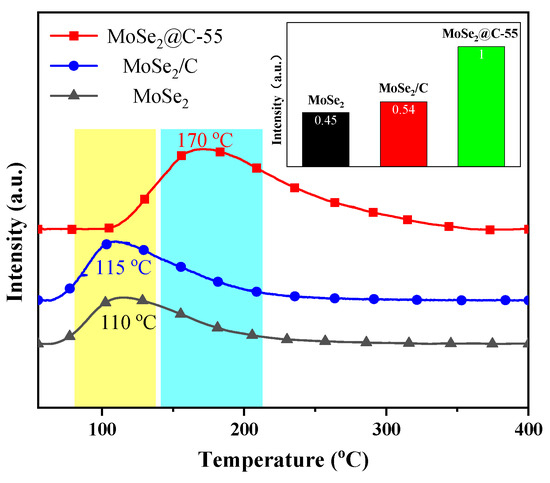 The adsorptive capacity of a catalyst for CO2 is an important factor in its catalytic performance in CO2 hydrogenation. Therefore, CO2-TPD was carried out, and the desorption curves are displayed in Figure 4. According to the characterization results, all the CO2 desorption peaks of the prepared MoSe2, MoSe2/C and MoSe2@C-55 catalysts appeared at low temperatures, which corresponded to the presence of weak basic sites on the catalyst surface [,]. Compared with MoSe2 and MoSe2/C, MoSe2@C-55 showed the highest desorption temperature of CO2, which means that the activation degree of CO2 on the surface of MoSe2@C-55 was the highest, which would be beneficial to the hydrogenation of CO2. Because the magnitude of the peak area corresponds to the quantity of activated CO2 present on the catalyst surface, the relative desorbed amount of CO2 was calculated by calculating the area of these peaks, and the results are also inset in Figure 4. Based on the desorption amounts of CO2 from MoSe2@C-55 (the relative value is 100%), the desorption amounts of CO2 from the surface of MoSe2 and MoSe2/C were 45% and 54% (by calculating the area of the CO2 desorption peak). These results suggest that the order of CO2 adsorption amounts on the catalyst surface and the ability to activate CO2 were MoSe2@C-55>MoSe2/C>MoSe2.