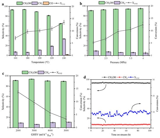 Catalytic performance of hydrogenation of CO2 over MoSe2@C-55 under different conditions: (a) effect of temperature; (b) effect of pressure; (c) effect of space velocity; (d) stability evaluation.