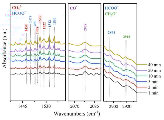 In order to explore the reaction mechanism of the hydrogenation of CO2 to generate methanol over the MoSe2@C-55 catalyst, the possible intermediates on the surface of MoSe2@C-55 were detected by in situ diffuse reflectance infrared Fourier transform spectroscopy (DRIFTS). Firstly, the catalyst was activated at 400 °C for 1 h in a pure H2 atmosphere and then refrigerated to 180 °C. Figure 6 shows the experimental results of the CO2 hydrogenation reaction stage at atmospheric pressure and a reaction temperature of 180 °C.