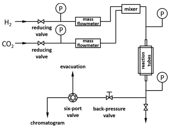 The hydrogenation of CO2 to yield methanol was performed in a fixed-bed reactor (inner diameter of 6 mm). The schematic diagram of the reaction device is shown in Figure 7. After the catalyst (0.5 g) was pretreated in pure H2 at 400 °C for 3 h and chilled to 180 °C, the feed gas (H2/CO2 ratio of 3/1) was introduced into the reactor under 3.0 MPa. The reaction tail gas was quantitatively analyzed using a gas chromatograph equipped with a hydrogen flame detector (GC-7900, Tianmei, Shanghai, China) and a thermal conductivity detector (GC-7890II, Tianmei, Shanghai, China).