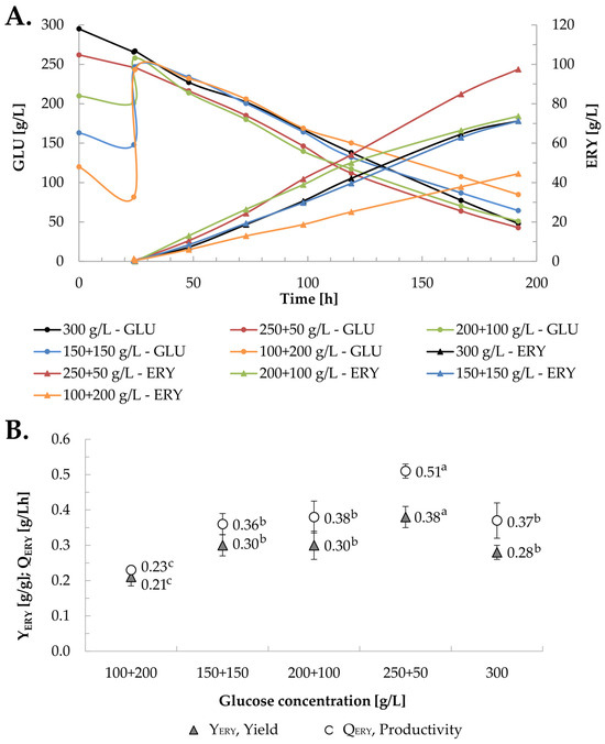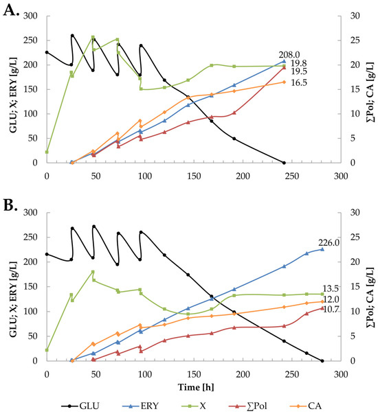 | Microorganism | Cultivation System; Tank Volume; Working Volume | GLU [g/L]; Nitrogen Source [g/L]; pH | ERY [g/L] | QERY [g/L/h] | YERY [g/g] | Ref. | |