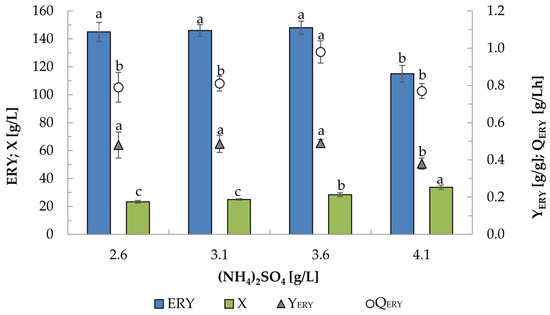 | Strain | Time [h] | ERY * [g/L] | YERY [g/g] | QERY [g/Lh] | qERY [g/gh] | S [%] | Foam ** |